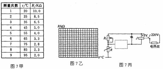 (1)将图7甲表格中的实验数据在给定的坐标纸上(图7乙)描绘出热敏电阻的阻值R随温度t变化的图像,并说明该热敏电阻的阻值随温度的升高而____________ (填“增大”或“减小”)。