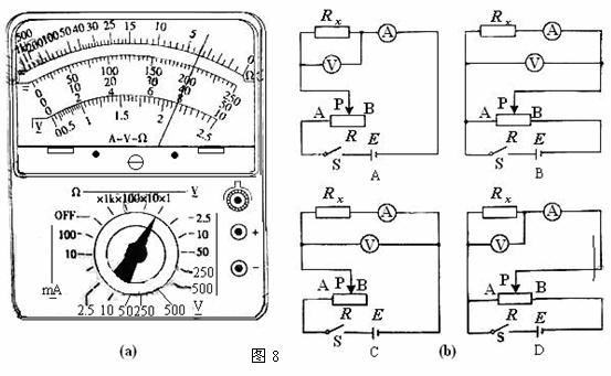 (2)根据多用电表示数,为了减少实验误差,并在实验中获得较大的电压调节范围,应从图8(b)的A、B、C、D四个电路中选择_________电路来测量金属丝电阻;