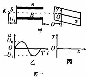 18.(18分)示波器的核心部分为示波管,如图11中甲所示, 真空室中电极K发出电子(初速不计),经过电压为U1的加速电场后,由小孔S沿水平金属板A、B间的中心线射入板中。板长L ,相距为d ,在两板间加上如图11乙所示的正弦交变电压,前半个周期内B板的电势高于A板的电势,电场全部集中在两板之间,且分布均匀。在每个电子通过极板的极短时间内,电场可看作恒定的。在两极板右侧且与极板右端相距D处有一个与两板中心线垂直的荧光屏,中心线正好与屏上坐标原点相交。当第一个电子到达坐标原点O时,使屏以速度v沿-x方向运动,每经过一定的时间后,在一个极短时间内它又跳回到初始位置,然后重新做同样的匀速运动。 (已知电子的质量为m ,带电量为e , 不计电子重力)。求: