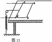 20.(18分)如图13所示,在一光滑水平的桌面上,放置一质量为M,宽为L的足够长“U”型框架,其ab部分电阻为R,框架其它部分的电阻不计。垂直框架两边放一质量为m、电阻为R的金属棒cd,它们之间的动摩擦因数为μ,棒通过细线跨过一定滑轮与劲度系数为k的另一端固定的轻弹簧相连。开始弹簧处于自然状态,框架和棒均静止。现在让框架在大小为2μmg的水平拉力作用下,向右做加速运动,引起棒的运动可看成是缓慢的。水平桌面位于竖直向上的匀强磁场中,磁感应强度为B。问: