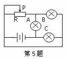 5、如图所示电路,电源电动势为E、内阻为r,接通电路后A、B、C三盏小灯都达到一定的亮度(但均未达到额定功率),当滑动变阻器的滑动头P向左滑动时,则( )
