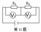 11、如下图所示,电阻R1=6kΩ,R2=4kΩ,两电压表示数均为35V,当两电压表位置对调后,V1表示数为30V,V2表示数为40V,则V1表的内阻Rv1=_______,V2表的内阻Rv2=__________.