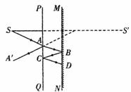 20.平面镜通常是在一定厚度的透明玻璃后表面镀银制成,从点光源S发出的光线经过玻璃前表面和镀银面多次反射,会生成关于S的多个像点。如下图所示,PQ、MN分别是前表面和镀银面与纸面的交线,SS’是垂直于PQ和MN的直线,AA’和AB分别是SA的反射光线和折射光线,BC是AB的反射光线,CC’(图中未画出)是BC的折射光线,下列判断正确的是 ( )
