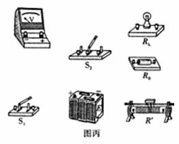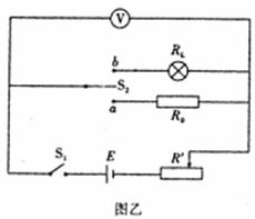 ② 现利用改装好的伏特表V和选用的器材设计如图乙所示的电路,来测量通过小灯泡的电流强度,请在图丙的实物图上连线。