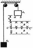 24.(17分)如图所示,细绳绕过轻滑轮连接着边长为L的正方形导线框A1和物块A2,线框A1的电阻R,质量为M,物块A2的质量为m(M>m),两匀强磁场区域Ⅰ、Ⅱ的高度也为L,磁感应强度均为B,方向水平且与线框平面垂直。线框ab边距磁场边界高度为h。开始时各段绳都处于伸直状态,把它们由静止释放,ab边刚好穿过两磁场的分界线CC′进入磁场Ⅱ时线框做匀速运动,不计绳与滑轮间的摩擦。求: