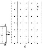 25.(22分)如图所示,在竖直平面内放置一长为L的薄壁玻璃管,在玻璃管的a端放置一个直径比玻璃管直径略小的小球,小球带电荷量为-q、质量为m。玻璃管右边的空间存在着匀强电场与匀强磁场的复合场。匀强磁场方向垂直于纸面向外,磁感应强度为B;匀强电场方向竖直向下,电场强度大小为mg/q。电磁场的左边界与玻璃管平行,右边界足够远。玻璃管带着小球以水平速度v0垂直于左边界向右运动,由于水平外力F的作用,玻璃管进入磁场后速度保持不变,经一段时间后小球从玻璃管b端滑出并能在竖直平面内自由运动,最后从左边界飞离电磁场。设运动过程中小球的电荷量保持不变,不计一切阻力。求: