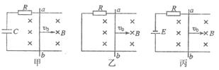 7.在图甲、乙、丙三图中,除导体棒ab可动外,其余部分均固定不动,甲图中的电容器C原来不带电.设导体棒、导轨和直流电源的电阻均可忽略,导体棒和导轨间的摩擦也不计,图中装置均在水平面内,且都处于方向垂直水平面(即纸面)向下的匀强磁场中,导轨足够长.今给导体棒ab一个向右的初速度v0 ,在甲、乙、丙三种情形下导体棒ab的最终运动状态是 ( )