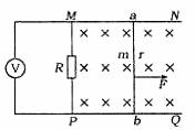 的电阻,电阻两端并联一电压表,垂直导轨跨接一金属杆ab,ab的质量m=