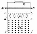 14.如图所示,光滑的“II”型金属导体框竖直放置,质量为m的金属棒MN与框架接触良好。磁感应强度分别为B1、B2的有界匀强磁场方向相反,但均垂直于框架平面,分别处在abcd和cdef区域。现从图示位置由静止释放金属棒MN,当金属棒进入磁场B1区域后,恰好做匀速运动,则若B2 B1,金属棒进入B2区域后仍将保持匀速下滑;若B2 B1,金属棒进入B2区域后可能先加速后匀速下滑(填>、<或=)