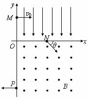 17.(12分)在平面直角坐标系xOy中,第I象限存在沿y轴负方向的匀强电场,第IV象限存在垂直于坐标平面向外的匀强磁场,磁感应强度为B,一质量为m,电荷量为q的带正电的粒子从y轴正半轴上的M点以速度v0垂直于y轴射入电场,经x轴上的N点与x轴正方向成60º角射入磁场,最后从y轴负半轴上的P点垂直于y轴射出磁场,如图所示,不计粒子重力,求: