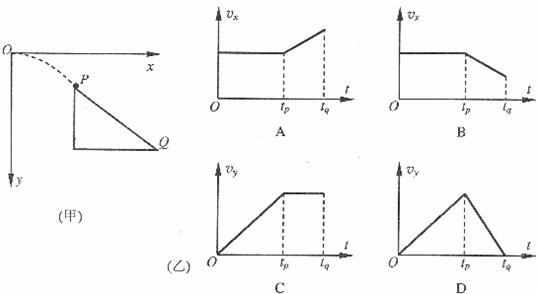 21.如下图(甲)所示,Ox坐标轴沿水平向右方向,Oy坐标轴沿竖直向下方向。水平抛出的小物体,到达一光滑斜面顶端P点时,其速度方向恰好沿斜面PQ方向,然后物体沿斜面滑下(不计空气阻力),图中(乙)描述了物体沿x方向和y方向运动的速度――时间图象,其中正确的是