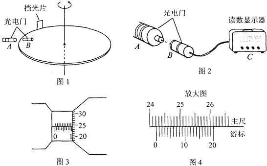 11.(6分)一水平放置的圆盘绕过其圆心的竖直轴匀速转动。盘边缘上固定一竖直的挡光片。盘转动时挡光片从一光电数字计时器的光电门的狭缝中经过,如图1所示。图2为光电数字计时器的示意图。光源A中射出的光可照到B中的接收器上。若A、B间的光路被遮断,显示器C上可显示出光线被遮住的时间。挡光片的宽度用螺旋测微器测得,结果如图3所示。圆盘直径用游标卡尺测得,结果如图4所示。由图可知,