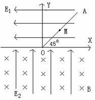 24.(17分) 如下图所示,X轴沿水平方向向右,Y轴沿竖直向上的方向,直线OA与X轴成45°角,X轴上方和下方分别有方向如图所示的匀强电场E1与E2,且E1=E2=103N/C,X轴下方还存在着垂直纸面向里的匀强磁场,磁感应强度B=2×103T,现有一质量m=