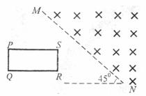 21.如图所示,PQRS为一矩形导线框,边PS水平放置,且PS=2PQ。它 以恒定的水平速度向右进入以MN为边界足够大的匀强磁场中,磁场方向垂直线框平面,MN直线与水平方向成45°角。从S点刚进磁场开始计时,设电流逆时针方向为正,则线框中的感应电流随时间的变化关系图象正确的是 ( )