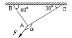 3.AB、AC两绳相交于A点,绳与绳、绳与天花板间夹角大小如图,现用一力F作用于交点A,与右绳夹角为