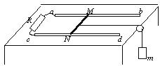 的平行光滑金属导轨ab与cd,阻值为R的电阻与导轨的a、c端相连。金属滑杆MN垂直于导轨并可在导轨上滑动。整个装置放于匀强磁场中,磁场的方向竖直向上,磁感应强度的大小为B。滑杆与导轨电阻不计,滑杆的中点系一不可伸长的轻绳,绳绕过固定在桌边的光滑轻滑轮后,与一质量为m的物块相连,拉滑杆的绳处于水平拉直状态。现若从静止开始释放物块,用I表示回路中的感应电流,g表示重力加速度,则在物块下落过程中物块的速度可能