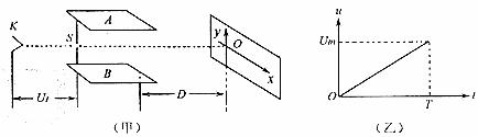 7.示波器是一种多功能电学仪器,可以在荧光屏上显示出被检测的电压波形。它的工作原理等效成下列情况:如图(甲)所示,真空室中电极K发出的电子(初速不计),经过电压为U1的加速电场后,由小孔S沿水平金属板A、B间的中心线射入两板间。在两极板右侧且与极板右端相距D处有一个与两板中心线垂直的范围很大的荧光屏,中心线正好与屏上坐标原点相交(x方向水平,y方向竖直),电子通过极板间打到荧光屏上将出现亮点。若在A、B两板间上如图(乙)所示的电压,则荧光屏上亮点的运动规律是( )