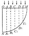 圆柱体棱镜的截面图,图中A、B、C、D、E将半径OM分成6等份,虚线AA1、BB1、CC1、DD1、EE1平行于半径ON,ON边可吸收到达其上的所有光线。已知该棱镜的折射率n=1.5,若平行光束垂直入射并覆盖OM,则光线 ( )