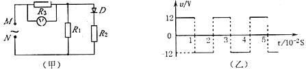 11.在如图(甲)所示电器中,D为理想二极管(正向电阻为零,反向电阻为无穷大)。R1=30Ω。R2=60Ω,R3=10Ω,在MN间加上如图(乙)所示的交变电压时,R3两端电压表的读数大约是 ( )