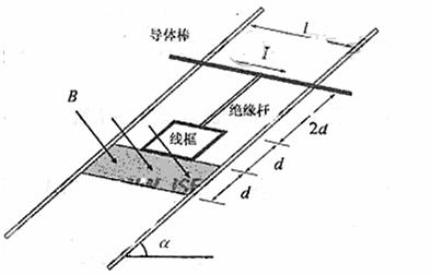 ”型装置,总质量为m,置于导轨上。导体棒中通以大小恒为I的电流(由外接恒流源产生,图中未图出)。线框的边长为d(d < l),电阻为R,下边与磁场区域上边界重合。将装置由静止释放,导体棒恰好运动到磁场区域下边界处返回,导体棒在整个运动过程中始终与导轨垂直。重力加速度为g。
