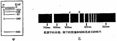 14.固甲所示为氢原子的能级,图乙为氢原子的光谱。已知谱线a是氢原子从n=4的能级跃迁到n=2能级时的辐射光,则谱线b是氢原子 ( )