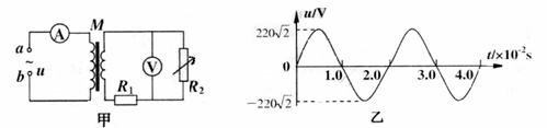 18.如图甲所示,M是一个小型理想变压器,原副线圈匝数之比n1:n2=10:1,接线柱a、b 接上一个正弦交变电源,电压随时间变化规律如图乙所示。变压器右侧部分为一火警报警系统原理图,其中R2为用半导体热敏材料(电阻随温度升高而减小)制成的传感器,R1为一定值电阻。下列说法中正确的是