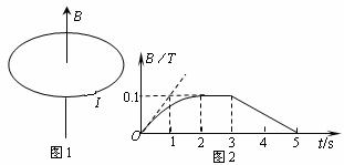 .如图1所示.磁场的磁感应强度B随时间t的变化规律如图2所示.则在时间0~5s内感应电流I的方向为__________________,线圈最大发热功率为______________W。