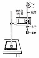 B.把打点计时器固定在置于桌边的铁架台上,将电火花计时器与电源连接好。将纸带 穿过计时器的限位孔,并把纸带的一端固定在重锤上,使重锤停靠在打点计时器附 近。