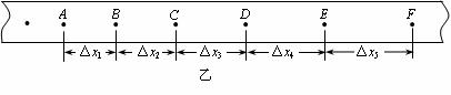 ⑵如图乙所示是某次实验中得到的一条纸带,其中A、B、C、D、E、F是计数点。两相邻计数点间的时间间隔为T,距离如图。则打C点时小车的速度为 ;要验证合外力的功与动能变化间的关系,除位移、速度外,还要测出的物理量有 。