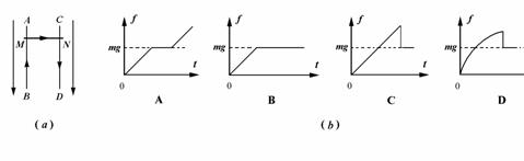 。现从t = 0时刻起,无初速度释放金属棒,同时给棒中通以图示方向的电流,且电流强度与时间成正比,即:I = kt,其中k为恒量。若金属棒与导轨始终垂直,则在图(b)所示的表示棒所受的摩擦力随时间变化四幅图中,正确的是