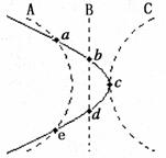 18.如图所示,A、B、C为等量异种电荷产生的静电场中的三个等势面,已知三个等势面的电势关系为φA<φB<φC。一带电粒子进入此静电场后,沿实线轨迹运动,依次与三个等势面交于a、b、c、d、e五点,不计粒子重力,下列说法正确的是