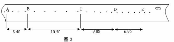 (2)若已得到打点纸带,并将测得各计数点间距标在下面(如图2),A为运动起始的第一点,则应选_______ 段来计算A车的碰前速度,应选 段来计算A车和B车碰后的共同速度。(以上两空填“AB”或“BC”或“CD”或“DE”)