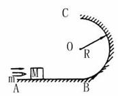 21.(10分)如图所示,ABC是光滑轨道,其中BC部分是半径为R的竖直放置的半圆。一质量为M的木块放在轨道水平部分,木块被水平飞来的质量为m的子弹瞬间射中,并滞留在木块中。若被击中的木块沿轨道能滑到最高点C,已知木块对C点的压力大小为(M+m)g,求:子弹射入木块前瞬间速度的大小。