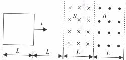 21.如图所示,为两个有界匀强磁场,磁感应强度大小均为口,方向分别垂直纸面向里和向外,磁场宽度均为L,距磁场区域的左侧L处,有一边长为L的正方形导体线框,总电阻为R,且线框平面与磁场方向垂直,现用外力F使线框以速度v匀速穿过磁场区域,以初始位置为计时起点,规定:电流沿逆时针方向时的电动势E为正,磁感线垂直纸面向里时磁通量