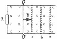 19.如下图所示,水平光滑的平行金属导轨左端接有电阻R,匀强磁场方向竖直向下,质量一定的金属棒OO/垂直于导轨放置,现使棒以一定的初速度v向右运动,当金属棒通过位置a、b时速度分别是va、vb,到位置c时刚好静止,导轨和金属棒的电阻不计,ab=bc,则金属棒在由a到b和由b到c的两个过程中 ( )