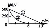 16.自动充电式电动车的前轮装有发电机,发电机与蓄电池连接.骑车者用力蹬车或电动车自动滑行时,发电机向蓄电池充电,将其他形式的能转化成电能储存起来.现使车以500J的初动能在粗糙的水平路面上自由滑行,第一次关闭自充电装置,其动能随位移变化关系如图线①所示;第二次启动自充电装置,其动能随位移变化关系如图线②所示,则第二次向蓄电池所充的电能是 ( )