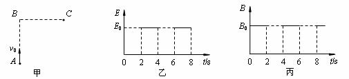 20.如图甲所示,在空间存在一个变化的电场和一个变化的磁场,电场的方向水平向右(图甲中由B到C),场强大小随时间变化情况如图乙所示;磁感应强度方向垂直于纸面、大小随时间变化情况如图丙所示。在t=1s时,从A点沿AB方向(垂直于BC)以初速度v0射出第一个粒子,并在此之后,每隔2s有一个相同的粒子沿AB方向均以初速度v0射出,并恰好均能击中C点,若AB=BC=l,且粒子由A运动到C的运动时间小于1s。不计空气阻力,对于各粒子由A运动到C的过程中,以下说法正确的是 ( )