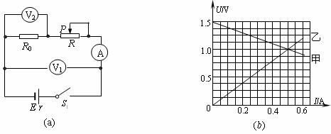 (2)(12分)两位同学在实验室利用如图(a)所示的电路测定定值电阻R0、电源的电动势E和内电阻r,调节滑动变阻器的滑动触头P向某一方向移动时,一个同学记录了电流表A和电压表V1的测量数据,另一同学记录的是电流表A和电压表V2的测量数据.并根据数据描绘了如图(b)所示的两条U―I直线.回答下列问题: