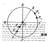 13、学校开展开研究性学习,某研究小组的同学根据所学的光学知识,设计一个测量液体折射率的仪器,如图所示,在一个圆盘上,过其圆心O作两条互相垂直的直线,BC.EF,在半径OA上,垂直盘面插上两枚大头针P1、P2,并保持位置不变,每次测量时让盘的下半部分竖直进入液体中,而且总使得液面与直径BC相平,EF作为界面的法线,而后在图中右上方区域观察P1、P2的像,并在圆周上插上大头针P3,使P3正好挡住P1、P2通过计算,预先在EC部分刻好了折射率的值,这样只要根据P3所插的位置,就可直接读出液体折射率的值。