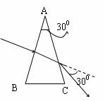 16.一个三棱镜的顶角为300,当一条光线从它的一个侧面AB垂直入射时,从另一个侧面AC射出,测得出射光线的方向相对于入射光线向棱镜底面偏折300,如下图所示,据此可知,该三棱镜的折射率为_______,光在该棱镜中的传播速度为________m/s.