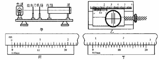 15.某同学用如图甲所示的实验装置,做《用双缝干涉测光的波长》的实验,他用带有游标尺的测量头(如图乙所示)测量相邻两条亮条纹间的距离△x。转动测量头的手轮,使分划板的中心刻线对齐某一条亮条纹(将这一条纹确定为第一亮条纹)的中心,此时游标尺上的示数情况如图丙所示;转动测量头的手轮,使分划板的中心刻线对齐第6条亮条纹的中心,此时游标尺上的示数情况如图丁所示,则图丙的示数x1= mm;图丁的示数x2= mm。