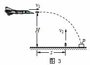 8、如图 3所示,在一次空地演习中,离地面 H 高处的飞机以水平速度 v1 发射一颗炮弹欲轰炸地面目标P,反应灵敏的地面拦截系统同时以速度 v2 竖直向上发射炮弹拦截,设拦截系统与飞机的水平距离为s ,不计空气阻力,则要成功拦截 v1、v2 的关系应满足 ( )