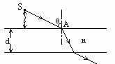 (2)(10分)在折射率为n、厚度为d的玻璃平板上方的空气中有一点光源S,从S发出的光线SA以角度θ入射到玻璃板上表面,经过玻璃板后从下表面射出,如下图所示。若沿此光线传播的光从光源到玻璃板上表面的传播时间与在玻璃板中的传播时间相等,点光源S到玻璃上表面的垂直距离