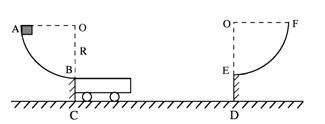 16.如图所示,固定在地面上的光滑圆弧轨道AB、EF,他们的圆心角均为90°,半径均为R。一质量为m 、上表面长也为R的小车静止在光滑水平面CD上,小车上表面与轨道AB、EF的末端B、E相切。一质量为m的物体(大小不计)从轨道AB的A点由静止下滑,由末端B滑上小车,小车在摩擦力的作用下向右运动。当小车右端与壁DE刚接触时,物体m恰好滑动到小车右端相对于小车静止,同时小车与DE相碰后立即停止运动但不粘连,物体则继续滑上圆弧轨道EF,以后又滑下来冲上小车。求: