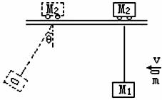 18.如下图所示,在光滑水平轨道上有一小车质量为M2,它下面用长为L的绳系一质量为M1的砂袋,今有一水平射来的质量为m的子弹,它射入砂袋后并不穿出,而与砂袋一起摆过一角度θ。不计悬线质量,试求子弹射入砂袋时的速度V0多大?