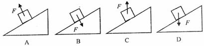 2.物体静止在固定的斜面上,分别按图示的方向对物块施加大小相等的力F,A中F垂直于斜面向上。B中F垂直于斜面向下,C中F垂直向上,D中F竖直向下,施力后物块仍然静止,则物块所受的静摩擦力增加的是 ( )