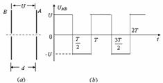 13.如图(a)所示,A、B是一对中间开有小孔的平行金属板,两小孔连线与金属板面垂直,两极板的距离为d,两极板间加上如图(b)低频交流电压(t=0时,A板电压为正),电压周期为T,现有一电子在t =0时穿过A孔的初速度可忽略不计,则电子在两板间的运动可能是 ( )