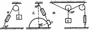 1.如下图所示,弹簧秤、绳和滑轮的重力及摩擦力均可不计,物体重量都为G。在甲、乙、丙三种情况下,弹簧的读数分别是F1、F