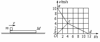 15.(12分)如图所示,质量为M的长木板,静止放置在粗糙水平地面上,有一个质量为m、可视为质点的物块,以某一水平初速度从左端冲上木板。从物块冲上木板到物块和木板达到共同速度的过程中,物块和木板的v-t图象分别如图中的折线acd和bcd所示,a、b、c、d点的坐标为a(0,1.0)、b(0,0)、c(4,0.4)、d(l2,0)。根据v-t图象,求: