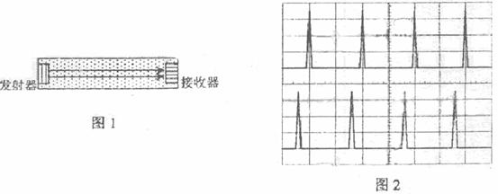 有一种示波器可以同时显示两列波形。对于这两列波,显示屏上横向每格代表的时间间隔相同。利用此种示波器可以测量液体中的声速,实验装置的一部分如图1所示:管内盛满液体,音频信号发生器所产生的脉冲信号由置于液体内的发射器发出,被接收器所接受。图2为示波器的显示屏。屏上所显示的上、下两列波形分别为发射信号与接收信号。若已知发射的脉冲信号频率为